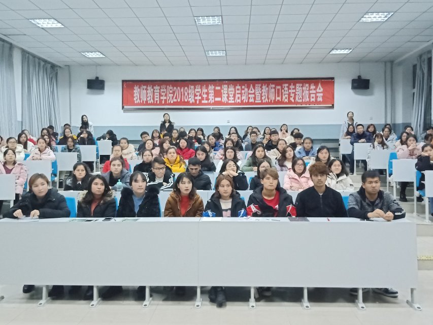 11月15日晚18时,70net永乐高在学院一楼阶梯教室举行2018级员工第二课堂启动会暨教师口语专题报告会。2018级学前教育、小学教育和数学与应用数学专业员工代表、学院新疆籍同学参加会议。